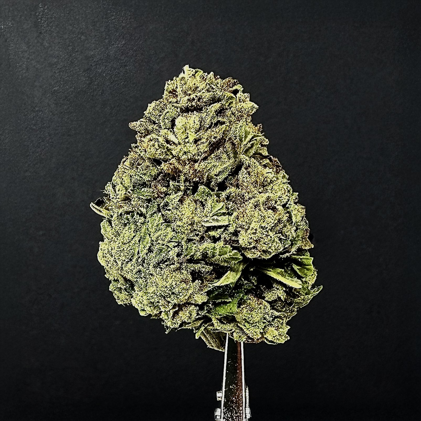 Sativa-hybrid. Sweet vanilla flavor with pineapple and nutty notes, and funk on the back end. Effects are mentally stimulating and a boost to creativity. Prominent terpenes are β-myrcene and limonene.